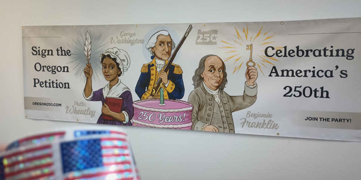 In preparation for our Oregon State Fair booth, we have produced this beautiful banner. The banner features our three historical figures we aim to highlight in our nation’s 250th celebration. One is Geroge Washington, who against the odds, defeated the British on won the liberties and freedom for all Americans. The second is Phillis Wheatley, an African American teenage girl who under threats of treason penned beautiful poems for the Revolutionary War and became an internationally-recognized poet. The third figure is Benjamin Franklin, who not only helped form our Constitution (he helped create the House and Senate structure as a great compromise) but he also was an avid slavery abolitionist and inventor as he the flexible catheter, bifocals, the Franklin stove, the odometer, and the glass harmonica. All three figures are highlighted in the Oregon Resolution to Celebrate America’s 250th Birthday by Recognizing 15 Historic American Achievements.